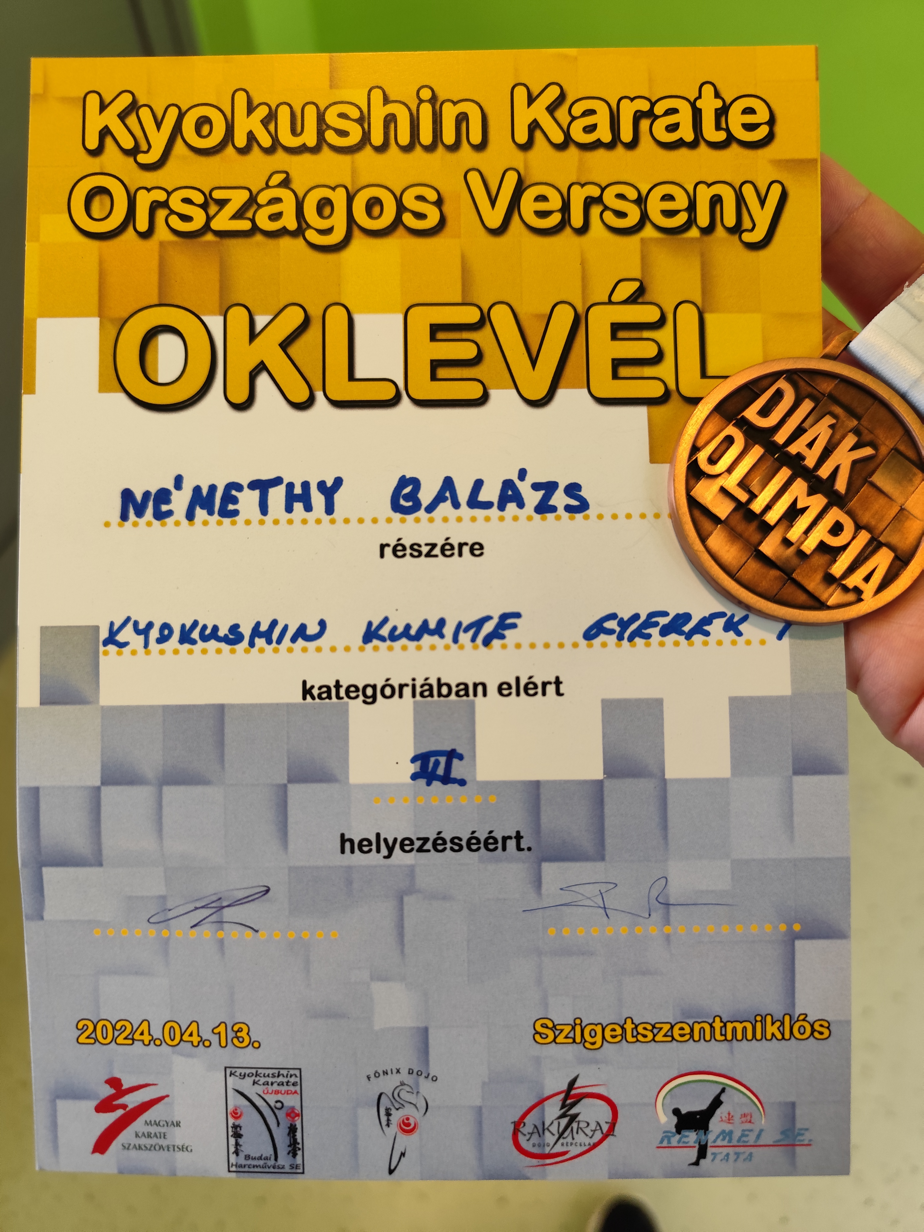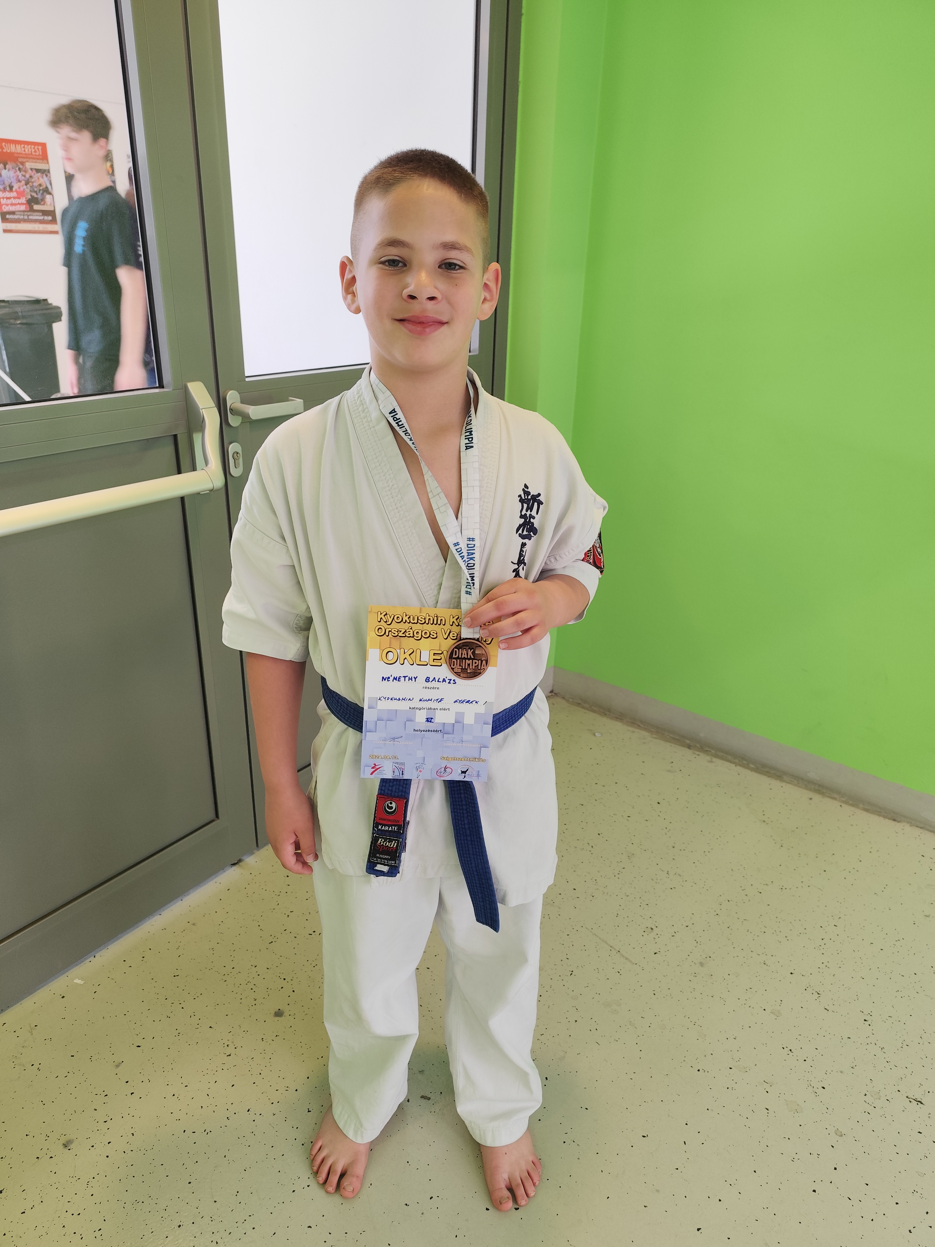 Szigetszentmiklóson rendezték meg a Kyokushin karate Diákolimpia döntőjét. Némethy Balázs 3.a osztályos tanulónk III. helyezést ért el testpajzs nélküli küzdelemben, a rendkívül sűűrű mezőnyben.