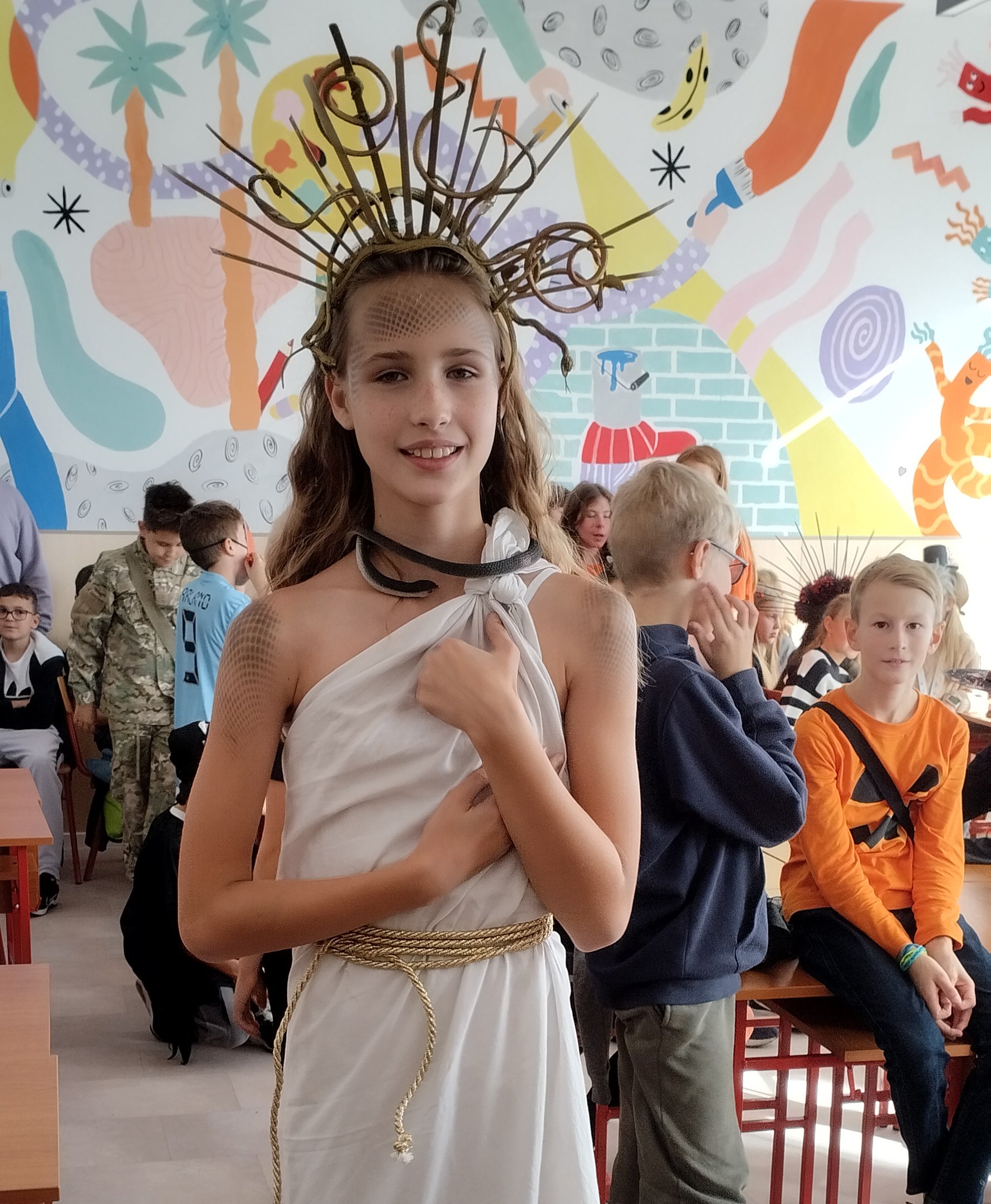Idén először jelmezversenyt is rendeztünk, ahol a témához illő halloweeni, ötletes, olykor rémisztő jelmezeket értékelte a zsűri. A legjobb jelmez, különleges fejdíszével a "Medúza" lett (Péter Anna 5.a).