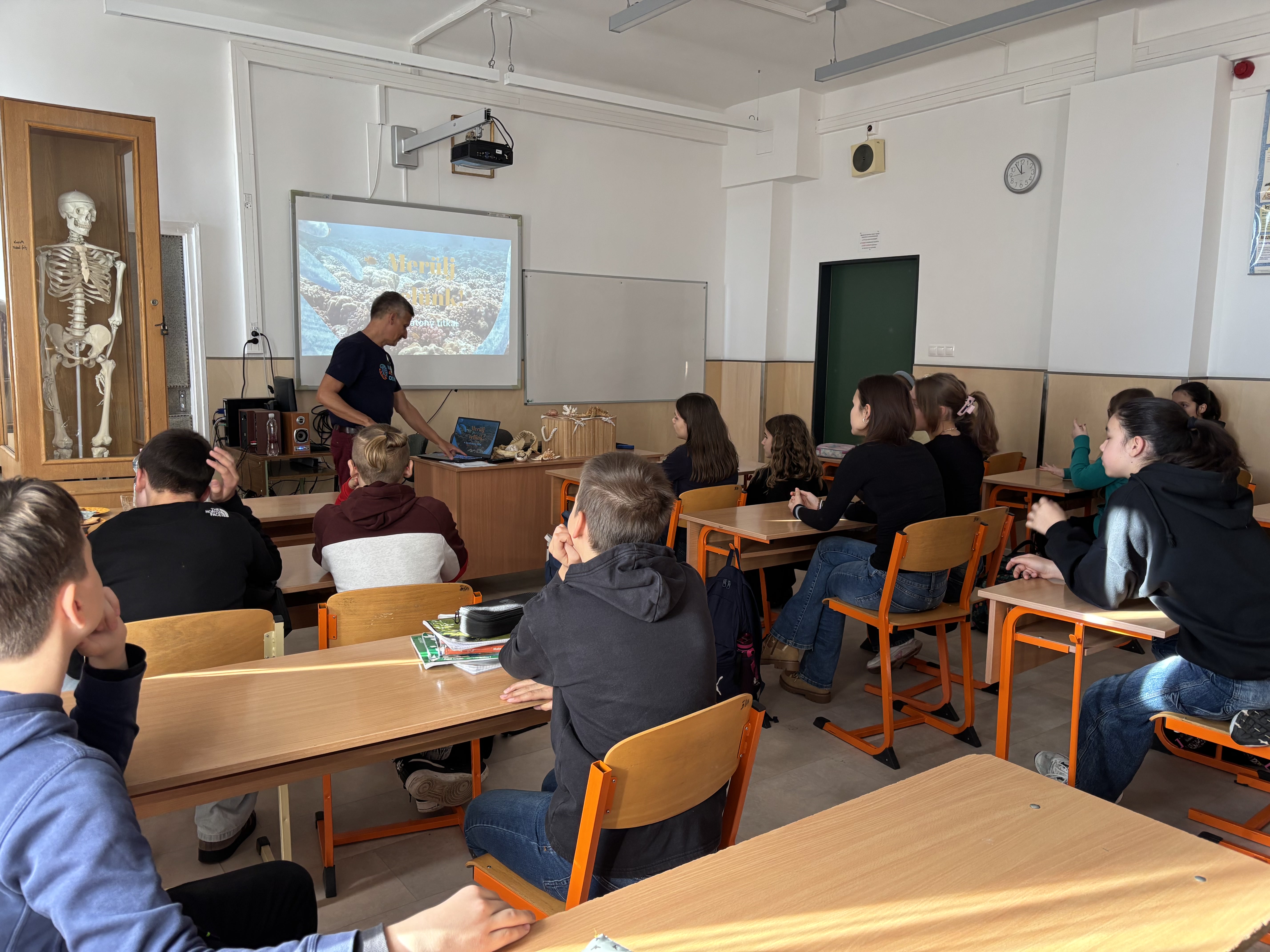 November 21-én iskolánkban járt Karáth Emil tengerbiológus, akinek segítségével a hetedik osztályos tanulóink megismerkedtek a trópusi, tengeri élővilággal, megtudták azt is, milyen élőlények élnek a korallzátonyokon, miből van a tengerpart finom homokja, miért húznak éjszakára pizsamát a papagájhalak, valamint hogyan üzemel a víz alatti wellness. Megérinthették a cápák bőrét, megvizsgálhatták az állkapcsát is.