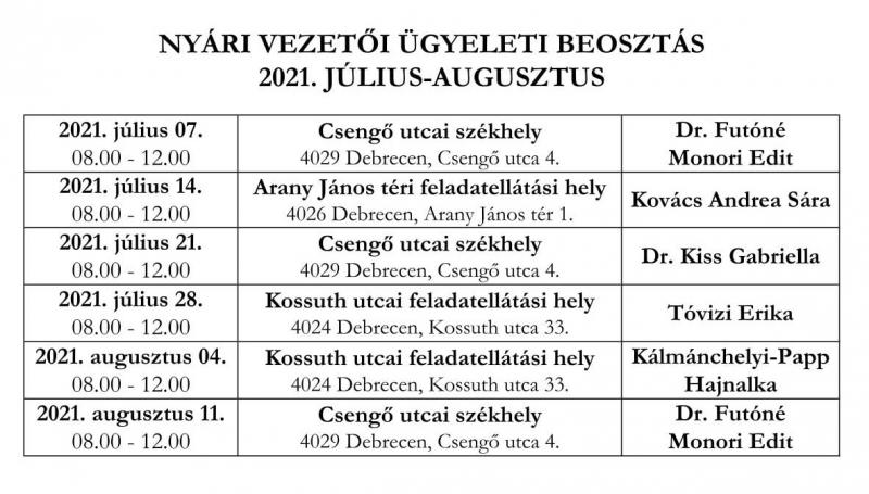 Nyári ügyelet | Kossuth Lajos Gyakorló Gimnáziuma és Általános Iskolája Kossuth utcai feladatellátási hely