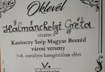 2019. február 11-én Kazinczy Szèp Magyar Beszéd városi versenyen vettünk részt amelyen 7-8. évfolyamos kategóriában Kálmánchelyi Gréta 7. c osztályos tanuló 5. helyezést ért el.